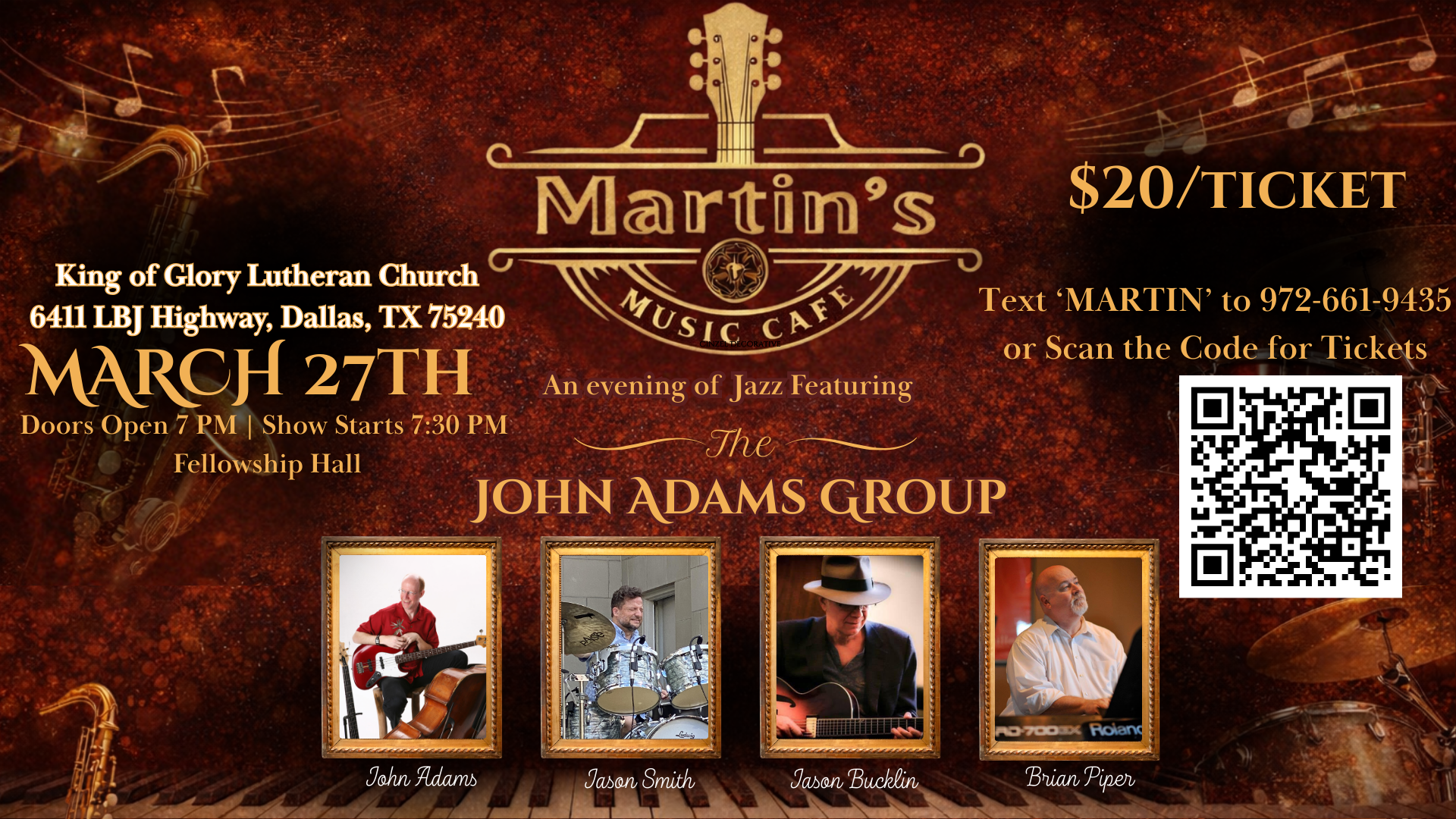 for an evening of outstanding live jazz. Featuring John Adams on bass, Brian Piper on keys, Jason Smith on drums, and Jason Bucklin on guitar, the group will perform a dynamic mix of classic jazz standards and modern jazz compositions. Many at King of Glory will remember Adams from the beloved Sunday morning jazz services that were once part of our worship life.