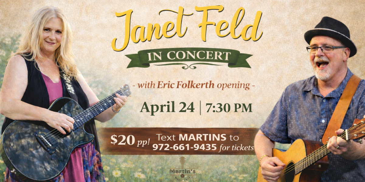 Join us for an evening of live acoustic music at Martin’s Music Café, featuring award-winning songwriter Janet Feld, with Eric Folkerth opening the night.